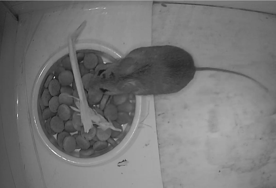 Seit ein paar Tagen hat eine kleine Waldmaus die Futterschale im Igel Schlafhaus 1 für sich entdeckt. Immer wieder quetscht sie sich unter der Rattenklappe hindurch und holt sich aus dem Schälchen ein Stück Katzen Trockenfutter. So auch heute Morgen. Doch irgendwie schien ihr der Futterraum etwas zu trist zu sein. Denn plötzlich kam in […]